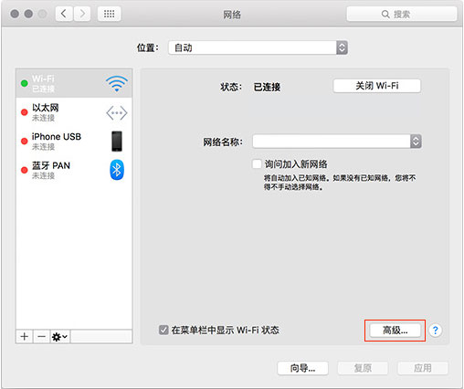 3. 从列表中选择相应的网络连接服务, 然后单击 “ 高级 ” 选项